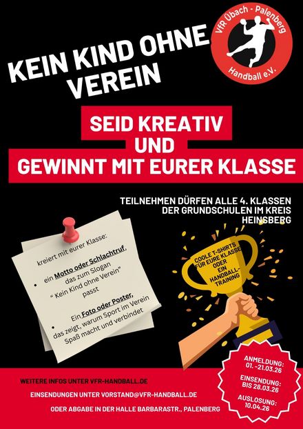 Zur Teilnahme reichen die Klassen eine kreative Gruppenaktion (Motto/Schlachtruf sowie Foto oder Poster zum Thema Vereinssport) ein; alle teilnehmenden Klassen bekommen eine Urkunde. Anmeldeschluss ist der 21.03.26, Einsendeschluss der 28.03.26, die Auslosung findet am 10.04.26 statt, die Gewinnübergabe Ende April.