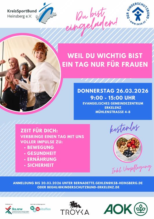 Im Rahmen der Internationalen Wochen gegen Rassismus laden der KreisSportBund Heinsberg e.V. und der Kinderschutzbund Erkelenz e. V. zu einem Frauentag mit den Themen Bewegung, Gesundheit, Ernährung und Sicherheit ein.